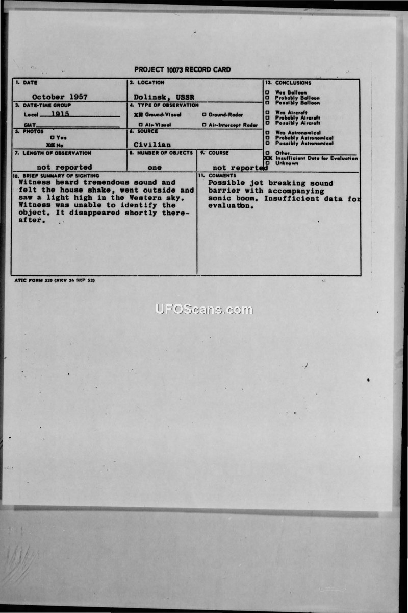 A civilian in Dolinsk, USSR, reported a loud sound and a light in the sky in October 1957. The official conclusion was that there was insufficient data to identify the object, though a sonic boom was suggested as a possibility.