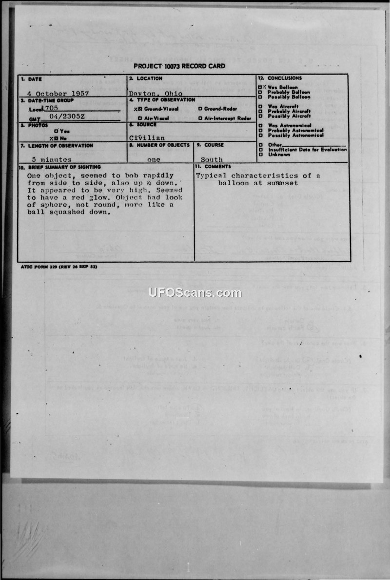 Project 10073 Record Cards and U.S. Air Force Technical Information Sheets — Dayton, Ohio, October 1957