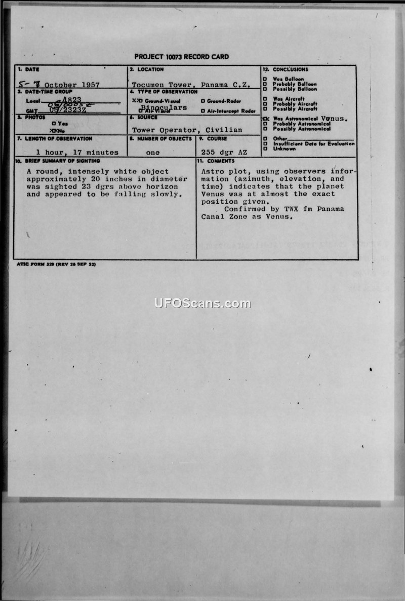 Project 10073 Record Card: Sighting of Planet Venus, Panama C.Z., October 1957