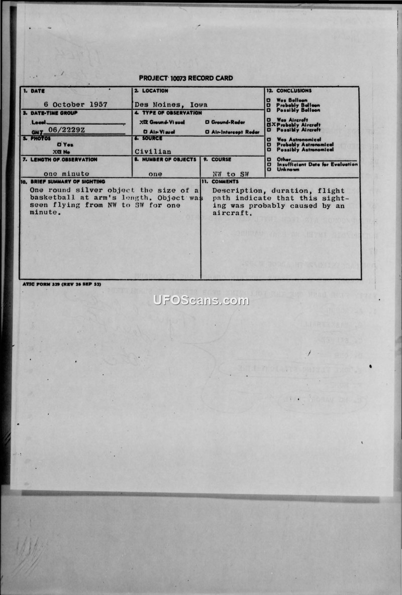 Project 10073 Record Card — Des Moines, Iowa, 6 October 1957