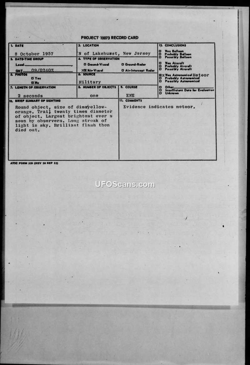 PROJECT 10073 RECORD CARD - 8 October 1957