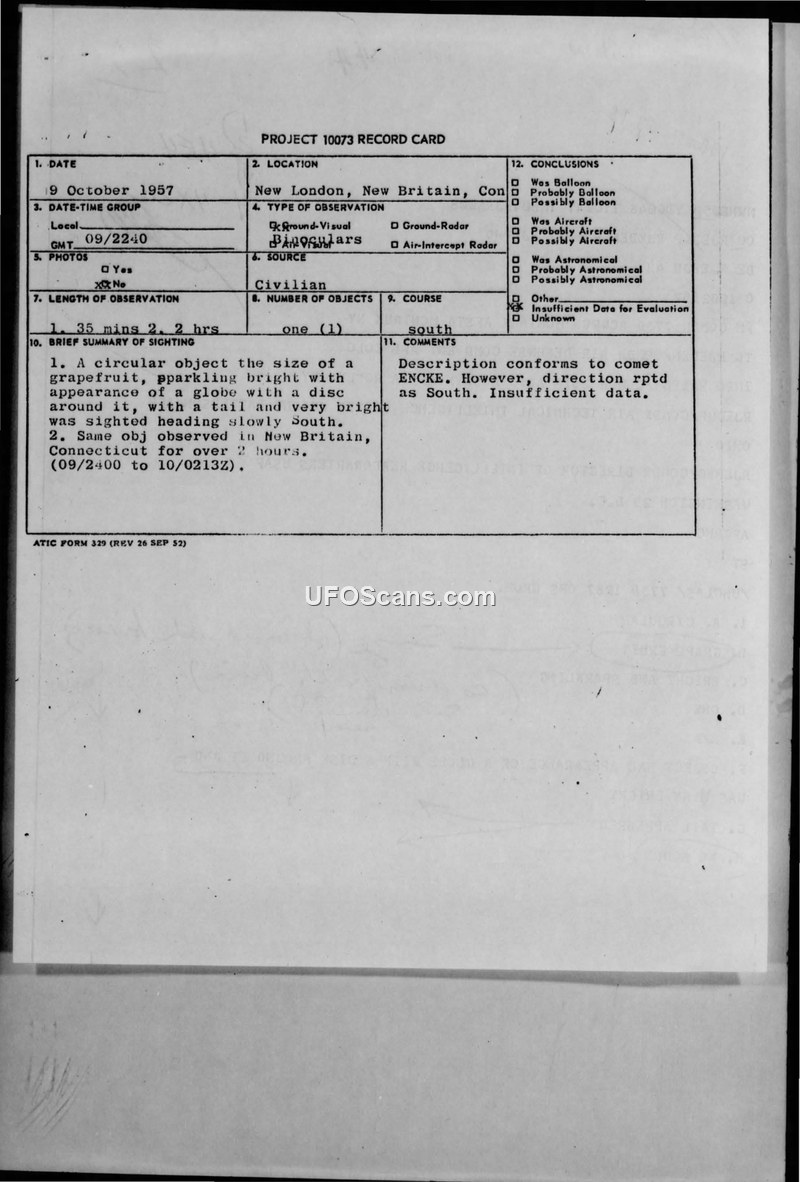 A 1957 sighting report from Connecticut describes a bright, circular object with a tail observed by multiple witnesses. The Air Technical Intelligence Center concluded there was insufficient data for evaluation, noting similarities to Comet Encke but citing discrepancies in movement.