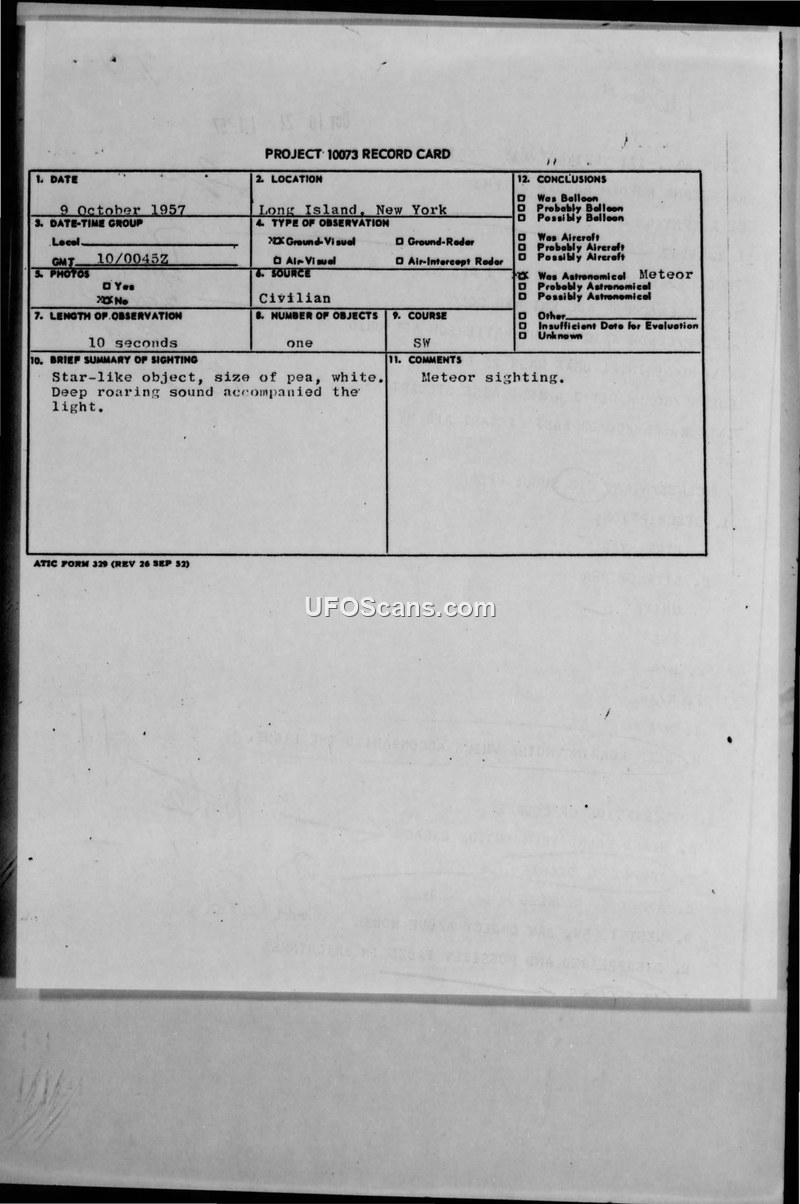 This document contains two Project 10073 record cards and associated military teletype reports regarding Unidentified Aerial Phenomena (UAP) sightings over Long Island, New York, in October 1957. The first incident occurred on October 9, 1957, at 0045Z. A civilian witness in Brentwood, Long Island, reported observing a white, star-like object, described as the size of a pea, moving from the west to the southwest. The witness reported a deep roaring sound accompanying the light. The military investigation concluded this was a meteor sighting. The second incident occurred on October 19, 1957, at 0440Z. A civilian witness in Westhempstead, Long Island, reported seeing several round, green objects that appeared like flares. The witness noted the objects were low on the horizon, appeared stationary, and eventually faded out of sight. This incident was also classified as a probable meteor sighting. Both reports include technical details such as weather conditions, observer identifying information, and the specific military units involved in the reporting chain, including the 26th Air Division at Roslyn AFS and the 4602nd AISS at Stewart AFB. The documents reflect the standard military procedure for documenting and evaluating civilian reports of aerial phenomena during this period, with the Air Technical Intelligence Center (ATIC) serving as the primary evaluation body.