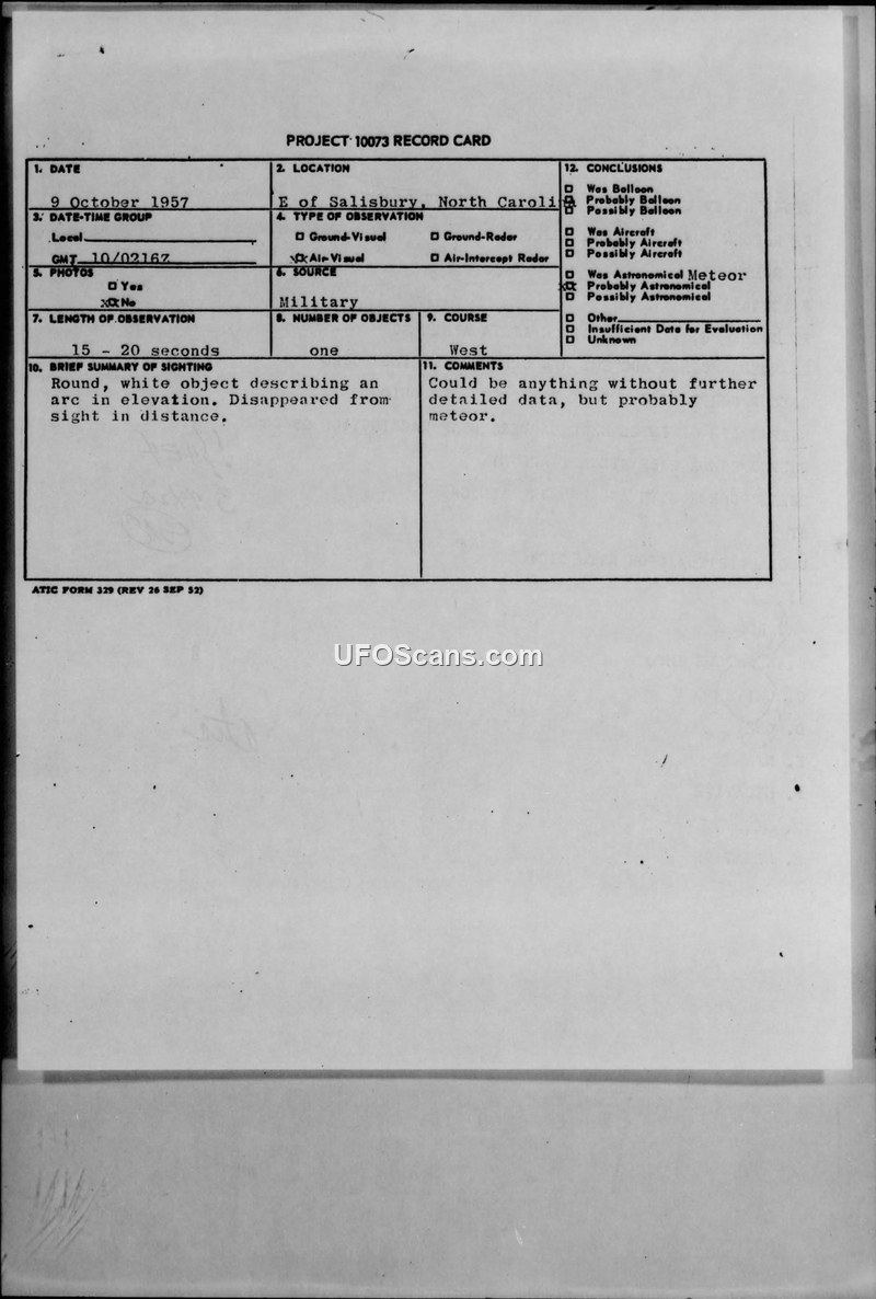 A military pilot reported a round, white object moving in an arc over North Carolina on 9 October 1957. The report was filed under Project 10073 and concluded the object was likely a meteor.