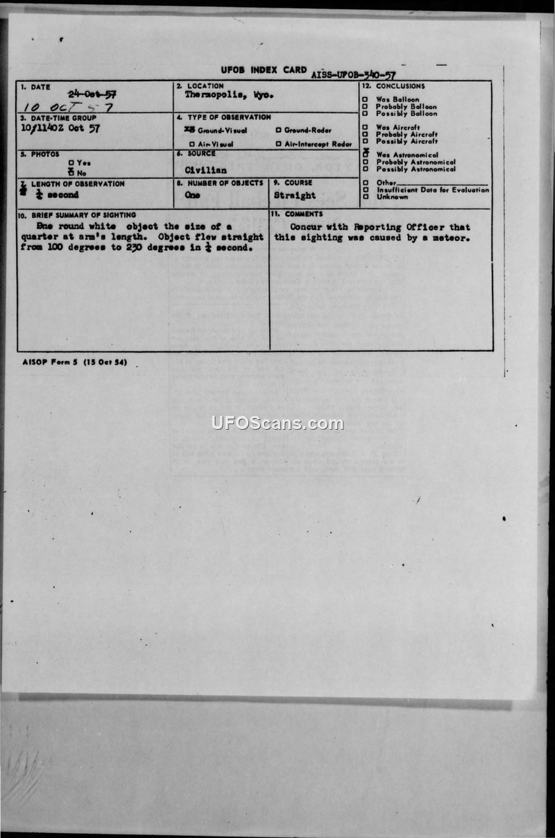 This document consists of a UFOB Index Card (AISS-UFOB-340-57) dated October 24, 1957, and an associated press clipping from the Associated Press dated October 10, 1957. The index card documents a sighting that occurred on October 10, 1957, at 1140Z in Thermopolis, Wyoming. A civilian witness reported observing a single, round, white object, described as being the size of a quarter at arm's length. The object was observed for approximately one-half second, moving in a straight path from 100 degrees to 230 degrees. The official conclusion recorded on the card is that the sighting was caused by a meteor. The accompanying press clipping provides broader context regarding a fireball sighting on the same day. It reports that a Navy transport plane carrying 39 passengers had a near-collision with a brilliant ball of fire, described as being as large as a house, which blazed across the western skies. The pilot, Lt. Cmdr. W. F. Norris, reported circling the area after the object crashed in rugged country near the Colorado-Utah border. Another pilot, Capt. E. A. Anderson, described the object as a big ball of blue-white fire that illuminated the cockpit. An Air Force bomber pilot, Lt. George Wortell, also reported the event, noting that he initially thought the object was on a collision course with his plane. Scientists quoted in the press report stated they were certain the object was a meteorite and unrelated to the Russian satellite launched the previous week.