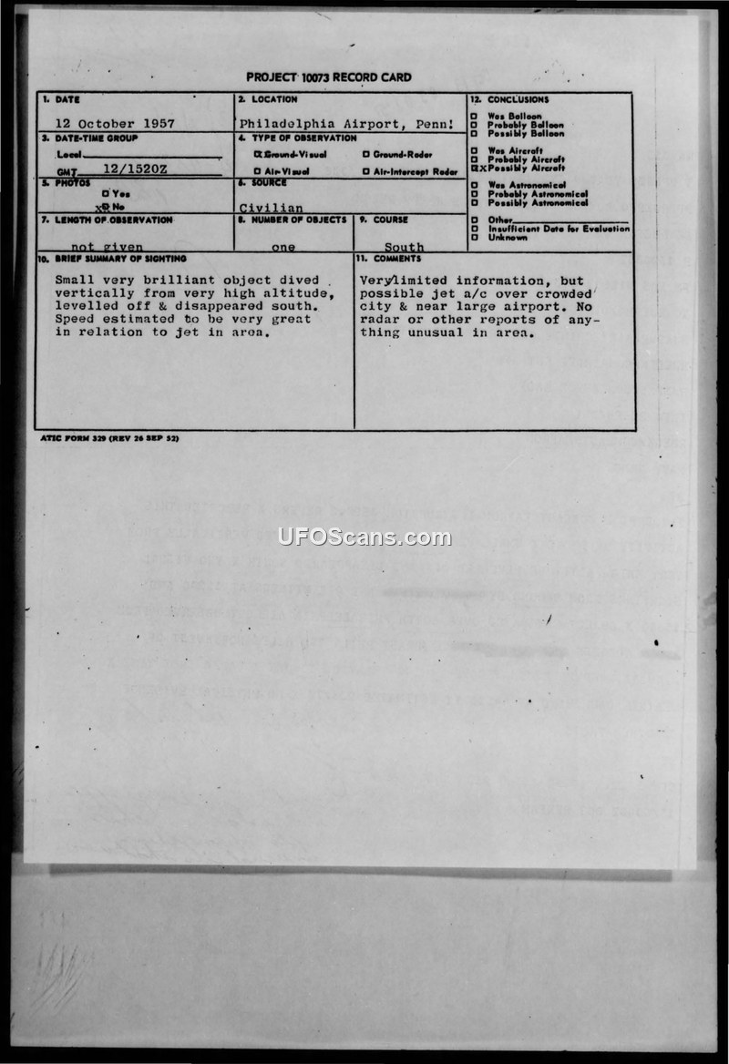Project 10073 Record Card — Philadelphia Airport, 12 October 1957