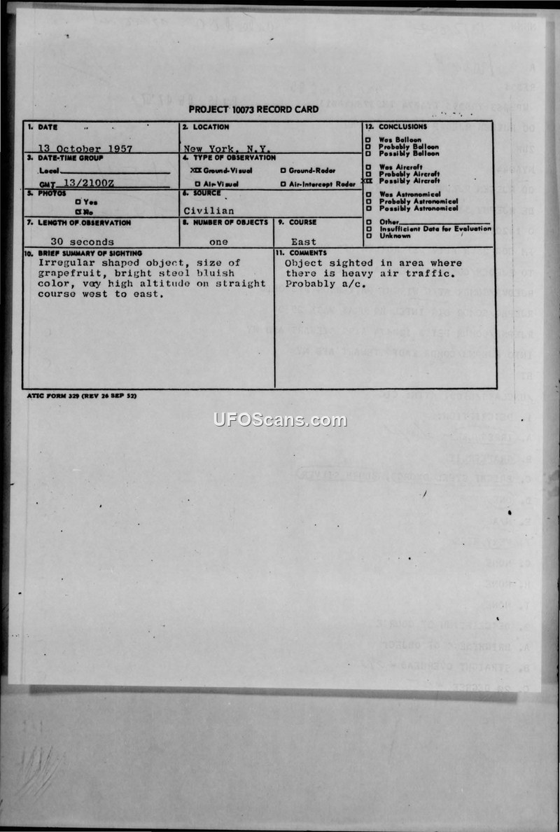 On October 13, 1957, at 2100Z, a civilian witness in New York, N.Y., reported observing an unidentified aerial object. The witness described the object as having an irregular shape, approximately the size of a grapefruit, with a bright steel bluish color. The object was observed at a very high altitude, traveling on a straight course from west to east. The duration of the observation was recorded as 30 seconds. The report was processed through military channels, including the 26th Air Division at Roslyn AFS, New York, and forwarded to the Air Technical Intelligence Center (ATIC) at Wright-Patterson AFB, Ohio. The official conclusion reached by the evaluating authorities was that the object was likely a conventional aircraft, citing the heavy air traffic in the New York area at the time of the sighting. The report notes that there was no radar contact and no photographs were taken. Weather conditions at the time were reported as clear.