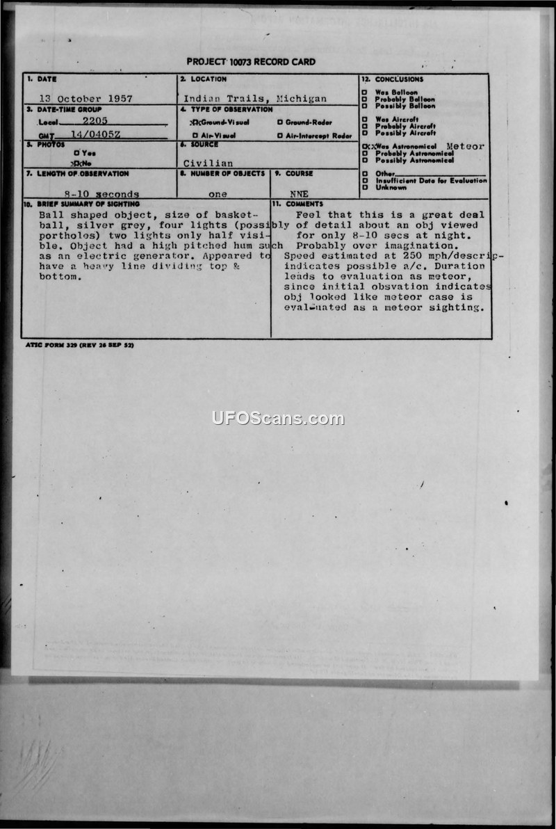 Project 10073 Record Card: Sighting at Indian Trails, Michigan, 13 October 1957