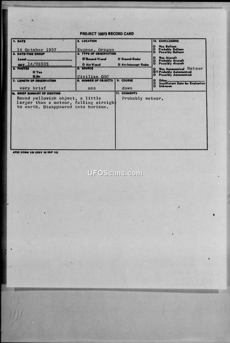 A GOC observer in Eugene, Oregon, reported a round, yellowish object falling vertically on 14 October 1957. The military investigation concluded the object was likely a meteor.