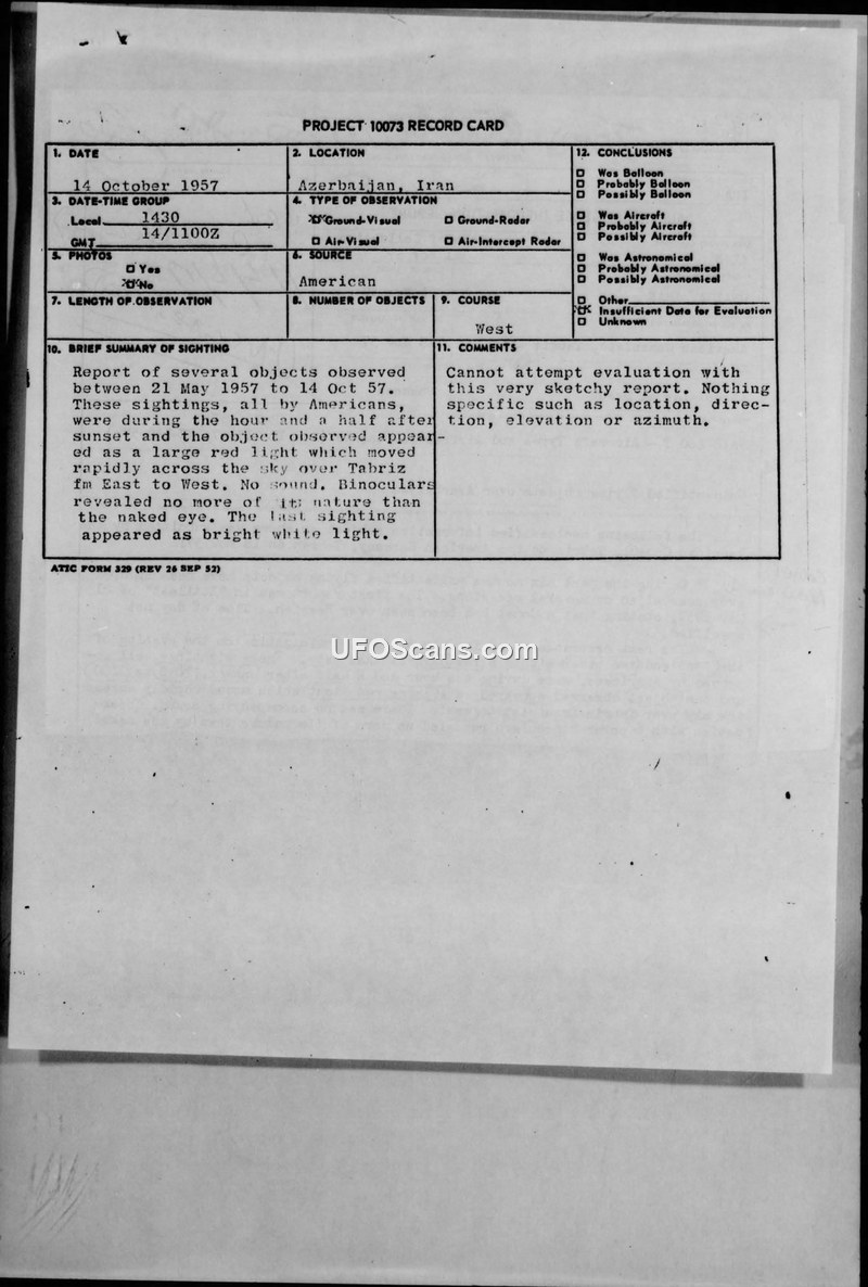 This intelligence report, dated November 21, 1957, documents a series of unidentified flying object sightings reported over Azerbaijan, Iran, between May 21, 1957, and October 14, 1957. The information was submitted by the American Consulate in Tabriz to the American Embassy in Tehran. According to the report, several sightings occurred during this period, all observed by Americans. The objects were typically seen during the hour and a half following sunset. Witnesses described the objects as large red lights that moved rapidly across the sky from east to west without making any sound. Observations made with 6-power binoculars did not provide further details regarding the nature of the objects compared to naked-eye observation. One specific sighting on October 14, 1957, was described as a bright white light seen by consulate staff and numerous Tabriz residents. This particular event was reported in the newspaper 'Ettilaat' on October 15, 1957, which speculated that the object might have been the Soviet satellite Sputnik I. An earlier report in 'Ettilaat' on May 21, 1957, mentioned a comet seen over Rezaieh. The preparing officer, Lieutenant Colonel Leo M. Braun, noted that this information was requested by the Air Attache during a meeting with consulate representatives. The official evaluation of these reports remained 'Unknown' or 'Insufficient Data,' as the accounts were considered too sketchy to provide specific details regarding location, elevation, or azimuth, rendering a formal analysis impossible.