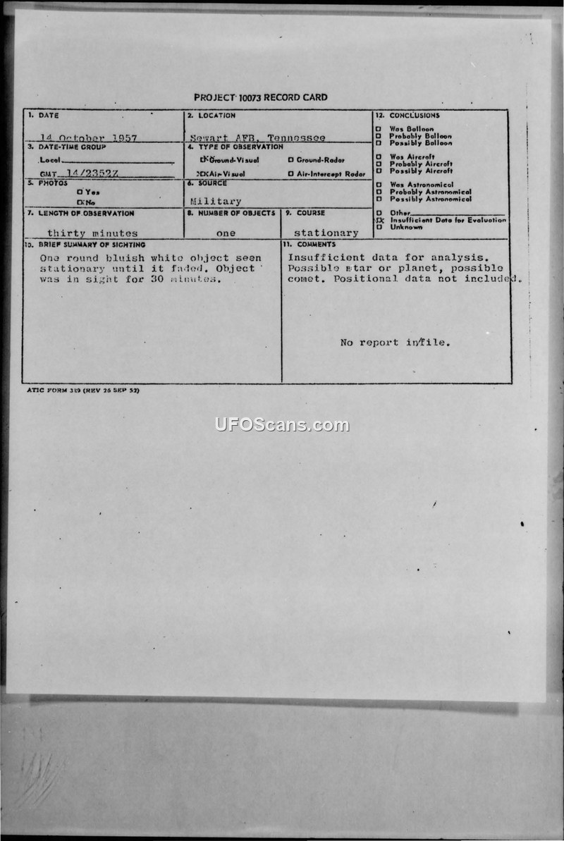 This document is a Project 10073 record card detailing a sighting that occurred on October 14, 1957, at Sewart Air Force Base in Tennessee. The report describes a single, round, bluish-white object that remained stationary for a duration of thirty minutes before fading from sight. The observation was classified as a ground-visual sighting. The record indicates that no photographs were taken and no radar contact was established. The official conclusion reached by the evaluating agency, ATIC, was that there was insufficient data to perform a definitive analysis. The report suggests the object may have been a star, planet, or comet, noting specifically that positional data was not included in the report. The card concludes with the administrative remark that there was no further report in the file.