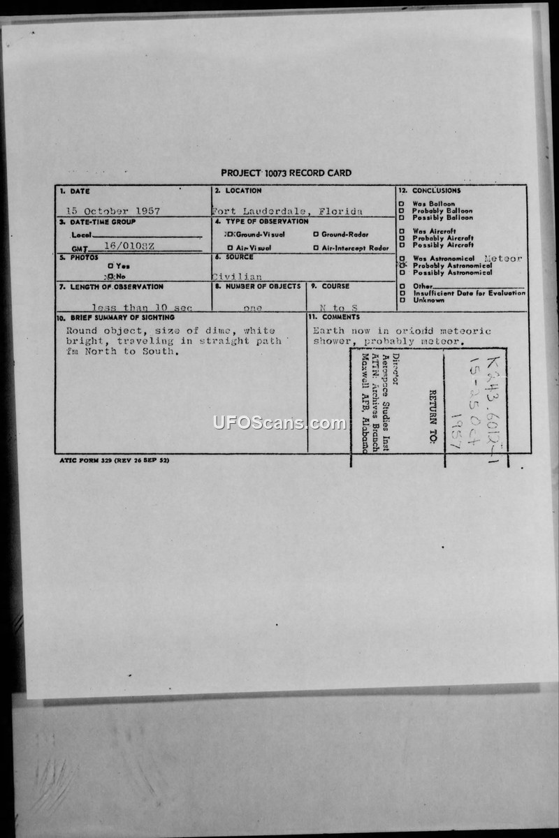 A civilian in Fort Lauderdale reported a bright, round object moving north to south on October 15, 1957. The Air Technical Intelligence Center concluded the object was likely a meteor associated with the Orionid meteor shower.