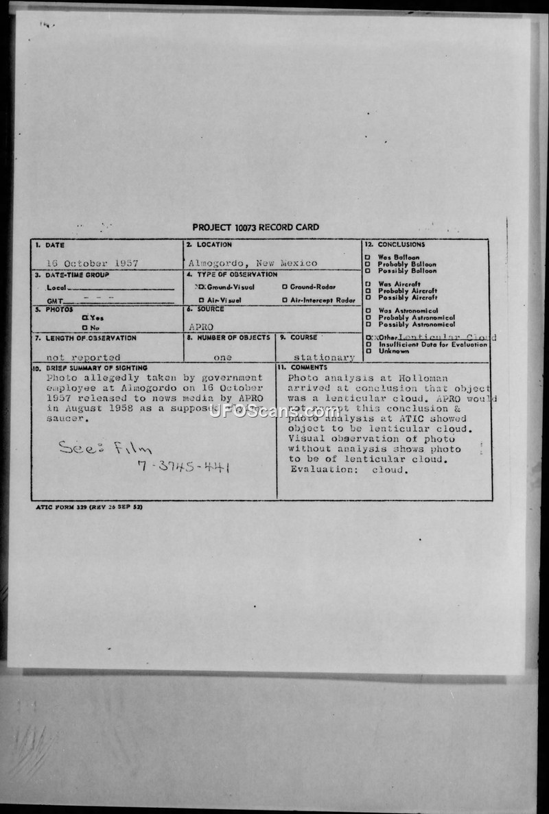 This document collection details the investigation of a photograph taken on 16 October 1957 near Alamogordo, New Mexico, by a government employee. The photograph, which depicts a saucer-shaped object, was released to the news media by the Aerial Phenomena Research Organization (APRO) in August 1958. APRO claimed the object was an unconventional aerial object, estimating its diameter at 4,000 feet and noting it hovered for 15 minutes. The case gained significant public attention, appearing in national magazines and newspapers, and was linked by APRO to comments made by the psychologist Dr. Carl Jung regarding the reality of UFOs and the potential for quasi-human pilots. The Air Force, specifically the Air Force Missile Development Center (AFMDC) at Holloman Air Force Base and the Air Technical Intelligence Center (ATIC), conducted a formal analysis of the original 35mm negative and color slide. Their conclusion was that the object was not a craft but a rare form of lenticular alto-cumulus cloud, illuminated by the sun in an unusual fashion. The Air Force investigators noted that the individuals who submitted the photograph were biased toward a UFO explanation and refused to accept the scientific evaluation provided by the military. The correspondence includes disposition forms, coordination sheets, and press clippings documenting the Air Force's efforts to address public and congressional inquiries regarding the incident, while maintaining that the object was a natural phenomenon. The file also contains internal discussions about the need to provide a clear, factual explanation to the public to counter the sensationalist claims made by APRO and other groups like NICAP, which were using the photograph to argue that the Air Force was withholding evidence of extraterrestrial craft.