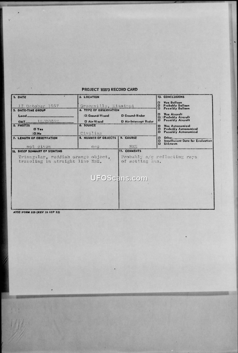 A civilian in Greenville, Mississippi, reported a triangular, reddish-orange object on 18 October 1957. Military authorities concluded the sighting was likely an aircraft reflecting the setting sun.