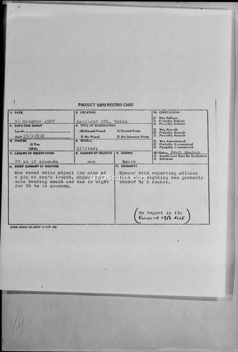Project 10073 Record Card — Lackland AFB, Texas, 18 October 1957
