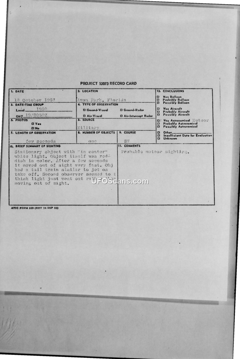 Project 10073 Record Card — Avon Park, Florida, 18 October 1957