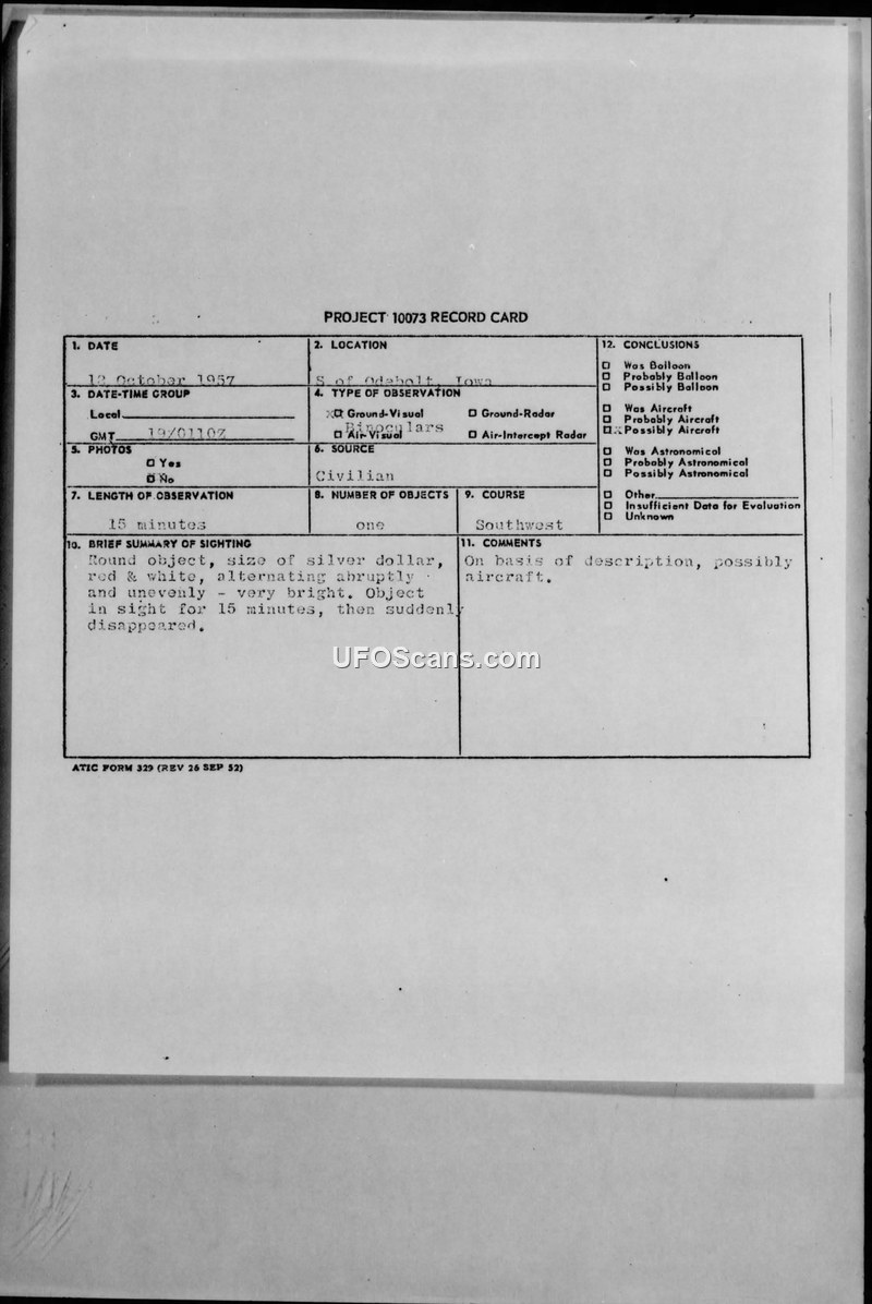 Three GOC observers in Odebolt, Iowa, reported a bright, round, red and white object on October 12, 1957. The military investigation concluded the object was possibly an aircraft.