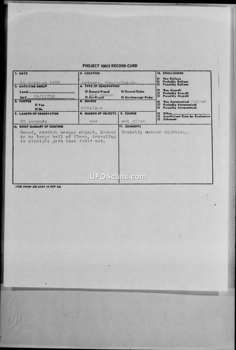 Project 10073 Record Card and Incident Report — Ardmore, Pennsylvania, October 1957