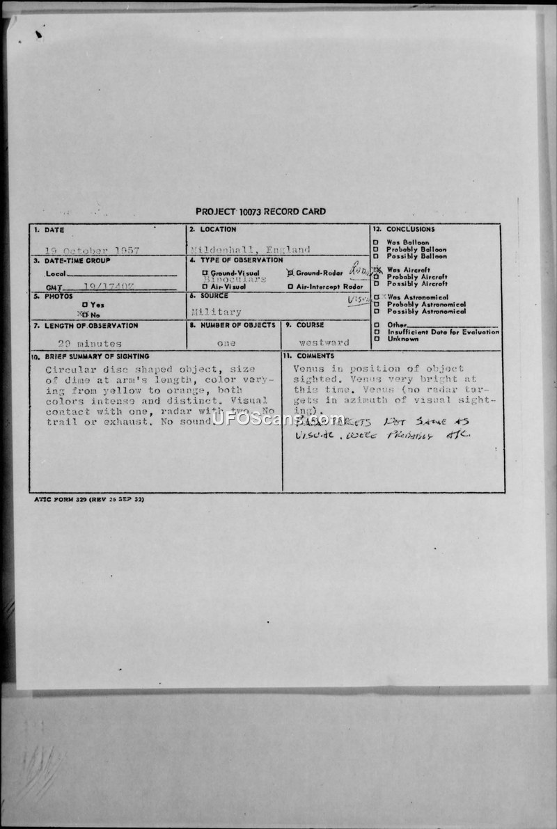 USAF personnel at RAF Mildenhall reported a circular, disc-shaped object on 19 October 1957. The investigation concluded the visual sighting was the planet Venus, while radar contacts were deemed separate.