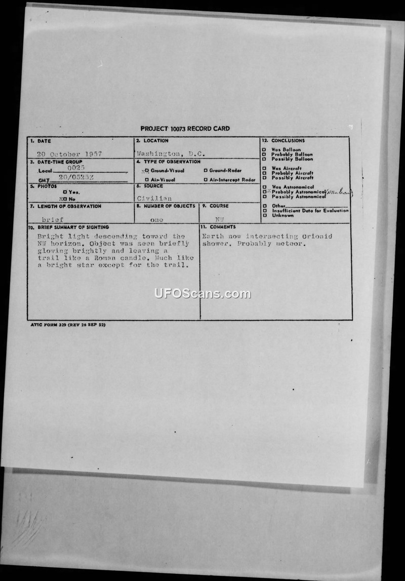 A civilian sighting of a bright, trailing light in Washington, D.C. on October 20, 1957, was officially identified as a meteor from the Orionid shower.
