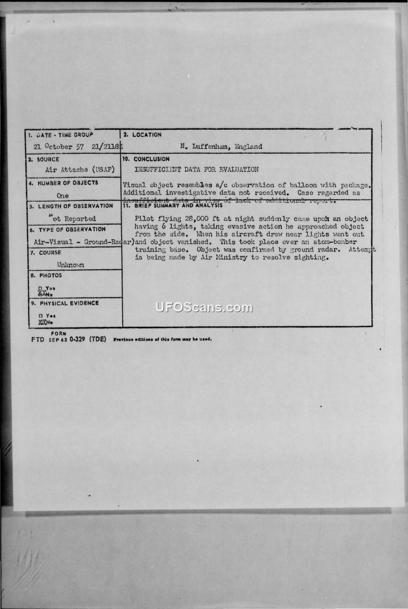 This document consists of a military sighting report and a follow-up intelligence cable regarding an Unidentified Aerial Phenomenon observed on October 21, 1957. At 21:18, Flying Officer D.W. Sweeney of the Royal Air Force was piloting a Meteor aircraft at an altitude of 28,000 feet near North Luffenham, England. During the flight, he encountered an object described as having six lights. Sweeney reported that the object was moving slowly and that he took violent evasive action to approach it from the starboard side. As his aircraft drew near, the lights on the object extinguished, and the object vanished. The pilot estimated his position at the time to be directly over Gaydon, an area used for training atom-bomber crews in Valiant aircraft. The sighting was corroborated by ground radar at RAF Station Langtoft, which confirmed the presence of an object at approximately 28,000 feet over the Gaydon area. A preliminary check of military and civil aircraft movements indicated that the Meteor was the only aircraft in the area at the time. The Air Ministry initiated an investigation into the incident, and the United States Air Force Air Attache in London sought to secure a copy of the final investigation report. Ultimately, the official conclusion recorded on the report form was that there was insufficient data for a definitive evaluation, noting that no additional investigative reports were received to clarify the nature of the object.
