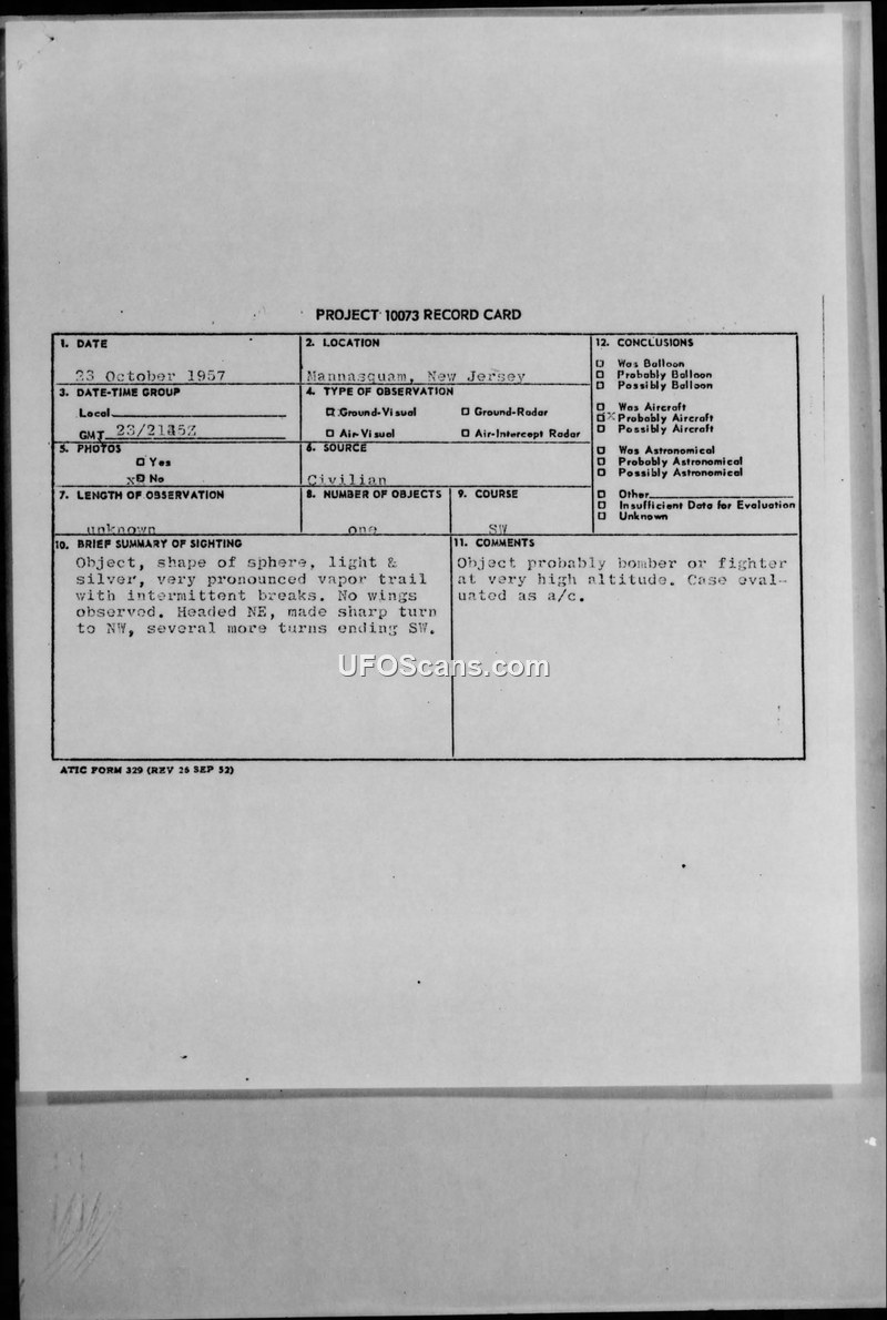 Project 10073 Record Card — Mannasquam, New Jersey, 23 October 1957