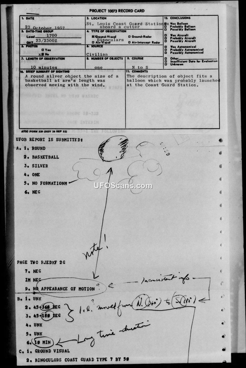 This document is a Project 10073 record card and associated teletype report concerning an Unidentified Aerial Phenomena (UFOB) sighting that occurred on October 23, 1957. The witness, a 22-year-old civilian named William Chanitz, observed the object while aboard a Coast Guard cutter at the St. Louis Coast Guard Station. The sighting lasted for approximately 10 minutes, beginning at 1700 local time. The object was described as a round, silver, basketball-sized entity observed at arm's length, moving from North to South. The witness utilized Coast Guard Type 7 by 50 binoculars to observe the object. The report includes detailed meteorological data, noting that the winds at the time coincided exactly with the movement of the object. The official conclusion reached by the investigating officer, 1st Lt. James S. Prowell of the 20th Air Division, was that the object was a balloon, likely launched from the Coast Guard Station. The report was processed in accordance with CONAD M 55-1 and forwarded to the Air Technical Intelligence Center at Wright-Patterson Air Force Base and the Director of Intelligence at HQ USAF.