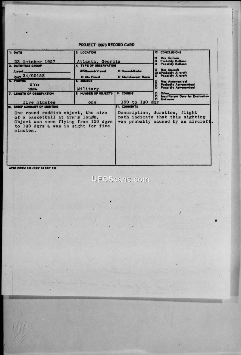Project 10073 Record Card — Atlanta, Georgia, 23 October 1957