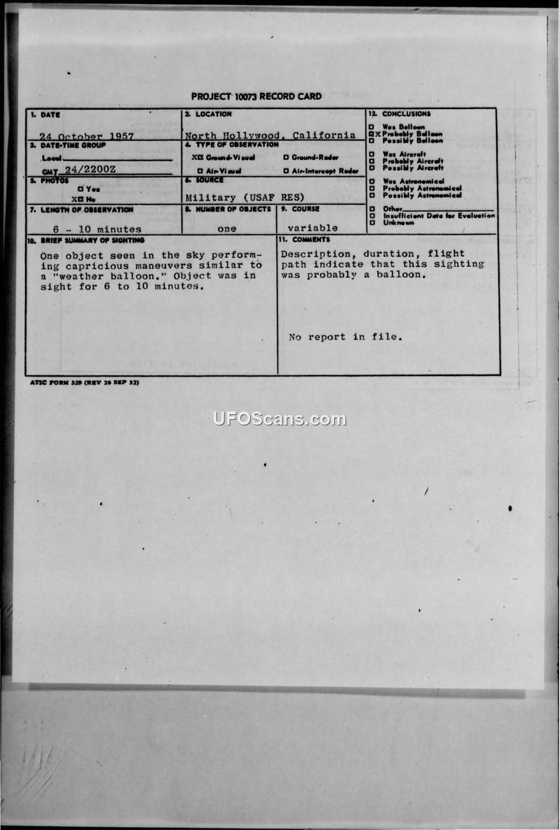 A 1957 sighting report from North Hollywood, California, involving a single object performing maneuvers similar to a weather balloon. The incident was officially concluded to be a balloon.