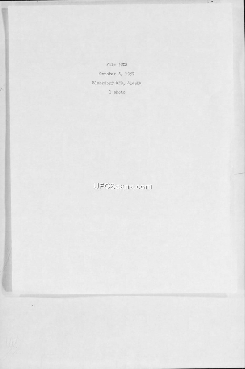 This document, dated October 8, 1957, serves as a record for File 5002, originating from Elmendorf Air Force Base in Alaska. The primary content of the file is a single photograph documenting the track of a USSR Earth Satellite. The document provides minimal narrative, functioning primarily as a cataloging record for the photographic evidence of the satellite's passage over the Alaskan region during the early period of the space race. The reference number ALASKA/IR-5004-11-57/2-G is associated with the photographic record.