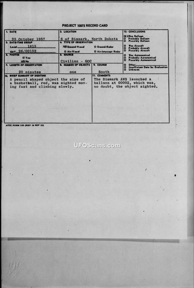This document consists of a Project 10073 record card and an associated Unidentified Flying Object report regarding a sighting that occurred on October 25, 1957, south of Bismarck, North Dakota. The sighting was reported by a Ground Observer Corps (GOC) observer and another individual near Ft. Rice. The witnesses described a pencil-shaped, red object, approximately the size of a basketball, which was observed moving fast and climbing slowly in a southerly direction for a duration of 20 minutes. The object was noted to have a flame at one end, similar to a gas flare, and eventually turned black before disappearing. The report includes detailed meteorological data for the area, including cloud cover at 1000-1500 feet and wind conditions. The official conclusion reached by the investigating officer, a 1st Lieutenant from the 786th ACWRON at Minot Air Force Station, was that the object was a weather balloon launched by the Bismarck AWS at 0000Z. Despite the witnesses' estimation that the object was 14 feet thick and 1/4 mile long, the report explicitly states that the weather balloon was, without doubt, the object sighted. The documentation includes the original teletype transmission sent to various Air Force intelligence and defense commands, including the Air Technical Intelligence Center at Wright-Patterson Air Force Base.