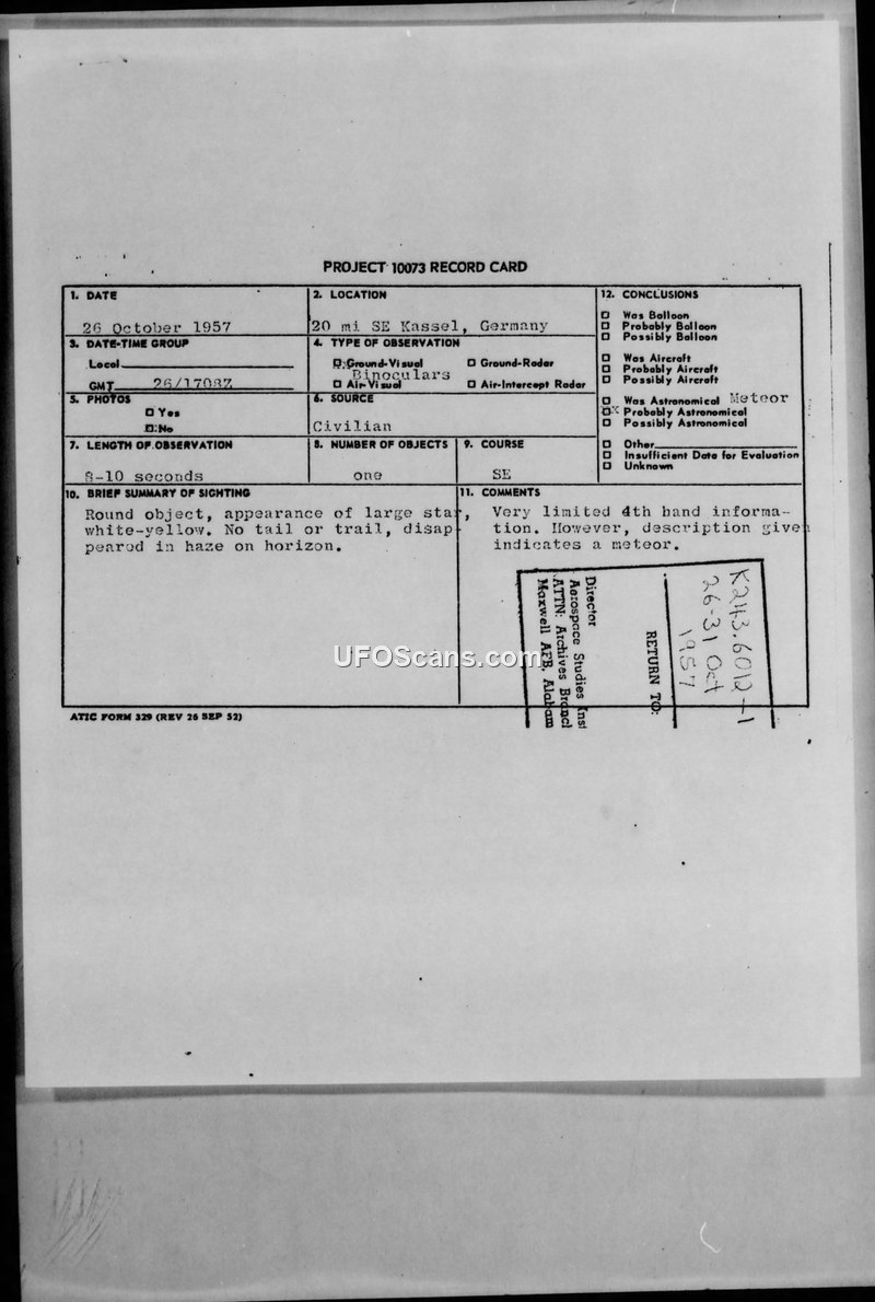 Project 10073 Record Card and Air Intelligence Information Report — 20 mi SE Kassel, Germany, 26 October 1957