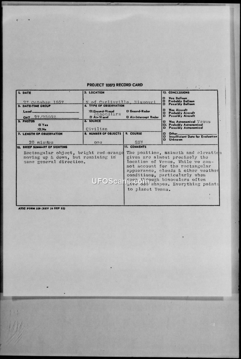 This document is a Project 10073 record card and associated military correspondence regarding a UFO sighting reported on October 27, 1957, north of Carlinville, Missouri. The witness, a 47-year-old Catholic priest, observed a single, bright red-orange, rectangular object for approximately 20 minutes while driving down a highway. The witness reported that the object moved up and down but remained in the same general direction. The observation was made using 6-power binoculars. The report was transmitted from the 23rd Air Division at Richards-Gebaur Air Force Base to the Air Technical Intelligence Center at Wright-Patterson Air Force Base. The official evaluation concluded that the sighting was likely the planet Venus. The investigators noted that the azimuth and elevation provided by the witness matched the position of Venus almost precisely. They suggested that the reported rectangular shape and movement were likely optical distortions caused by atmospheric conditions, clouds, or the use of binoculars, rather than an actual physical object of the nature described by the witness.