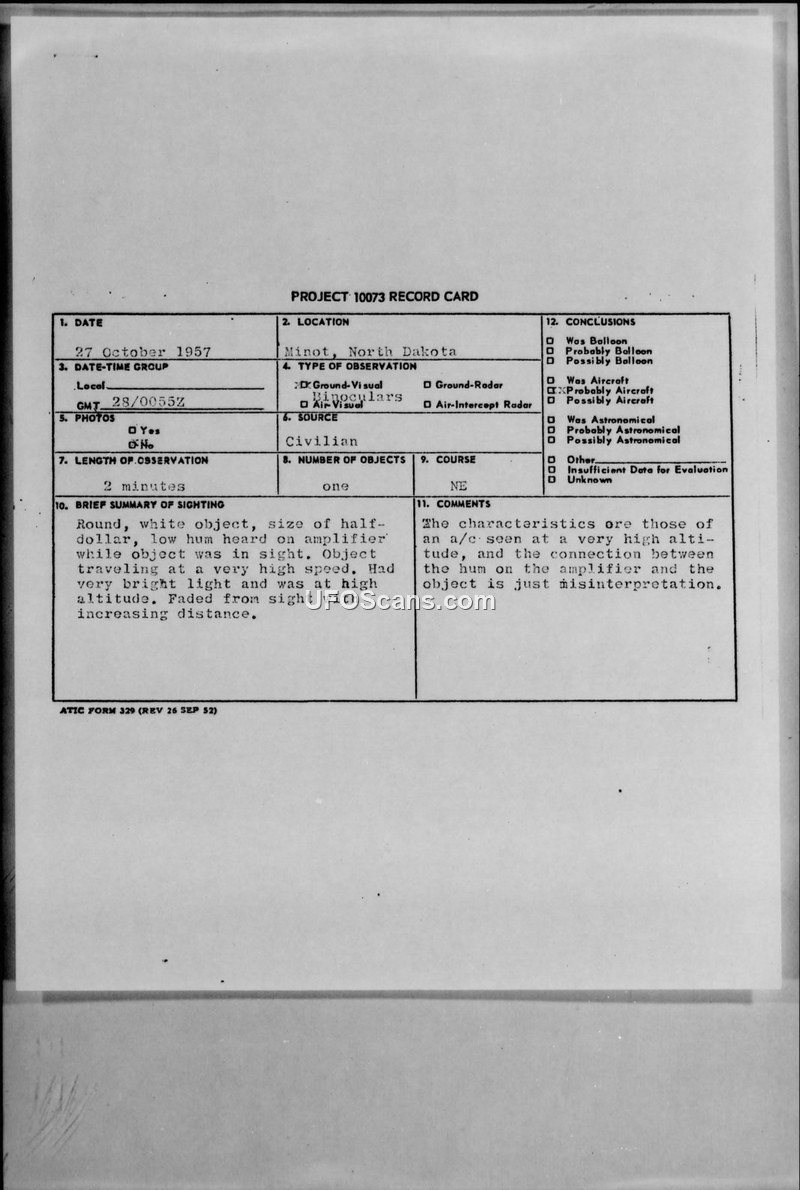 Project 10073 Record Card — Minot, North Dakota, 27 October 1957