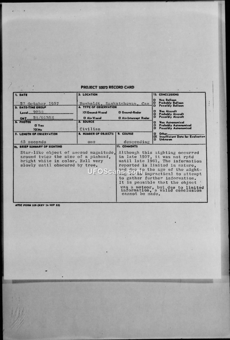 PROJECT 10073 RECORD CARD — Humboldt, Saskatchewan, 27 October 1957