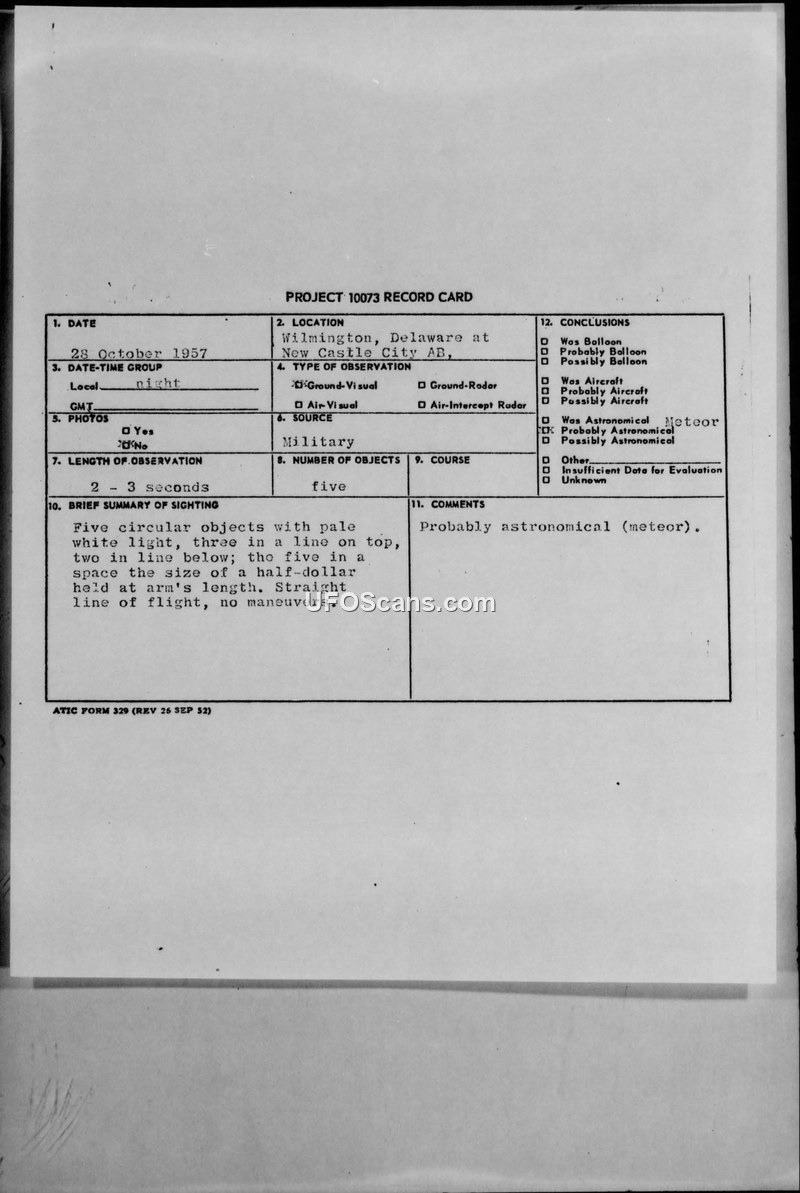 On 28 October 1957, at night, Airman Third Class Leo L. Fox of the 82nd Air Base Squadron, stationed at New Castle County Air Base in Wilmington, Delaware, observed an unidentified aerial phenomenon. The witness reported seeing five circular objects emitting a pale white light. The objects were arranged in a specific formation, with three in a line on top and two in a line below, occupying a space equivalent to the size of a half-dollar held at arm's length. The objects traveled in a straight line without maneuvers, moving from the zenith to approximately 20 degrees above the northern horizon before fading out. The entire event lasted between two and three seconds. The weather conditions at the time were reported as clear with very few clouds. Lieutenant Colonel Bradley F. Prann, the Group Operations Staff Officer, conducted a personal interview with the witness. In his report, Prann noted that the observer appeared to be intelligent and perceptive, yet no definitive explanation could be provided for the observation at the time of the report. The official conclusion recorded on the Project 10073 record card and the intelligence report suggests the objects were likely astronomical in nature, specifically a meteor. The report was distributed to the Air Technical Intelligence Center (ATIC), the Air Defense Command (ADC), and the Assistant Chief of Staff for Intelligence (ACS/I) at Headquarters USAF.