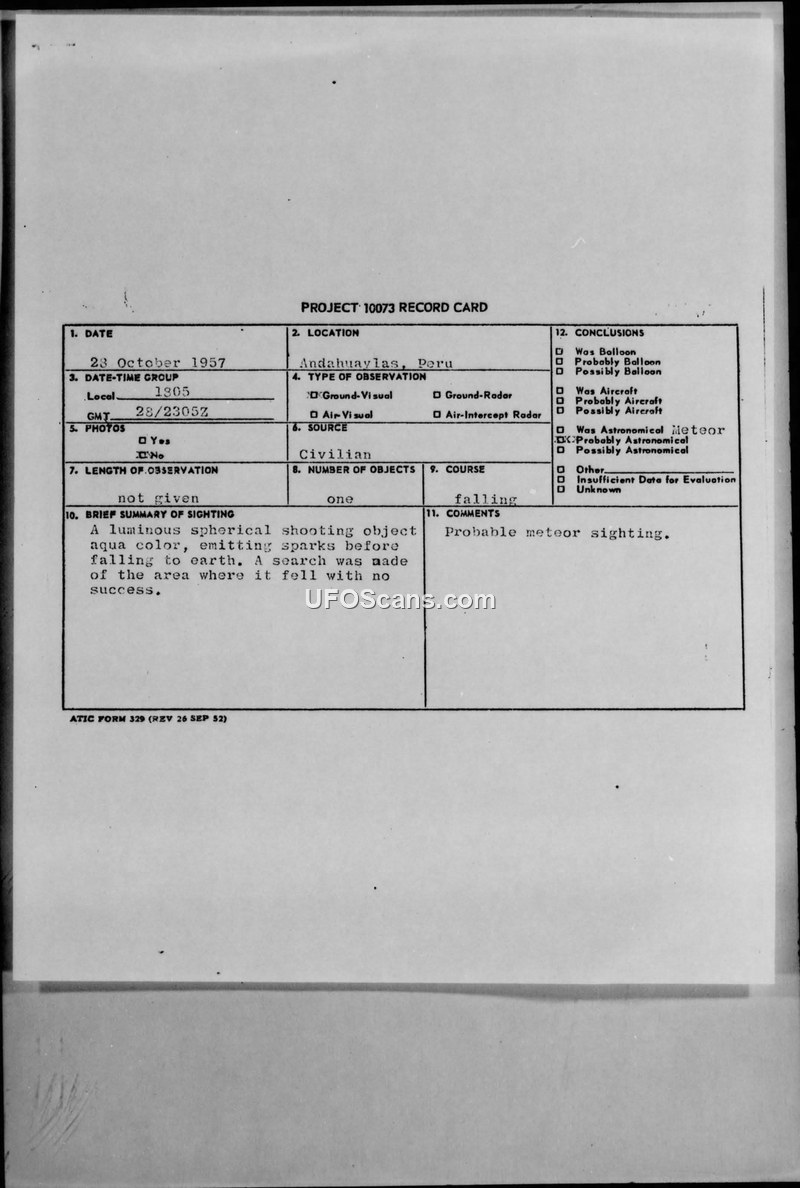 An Air Intelligence report details a 1957 sighting in Andahuaylas, Peru, of a small, aqua-colored, sparking spherical object that fell to earth. Despite a search, no evidence was found, and the event was officially classified as a probable meteor.