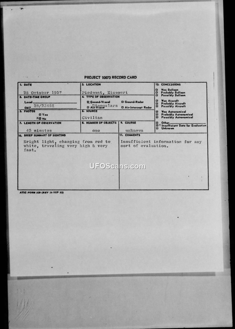 Project 10073 Record Card — Piedmont, Missouri, 28 October 1957