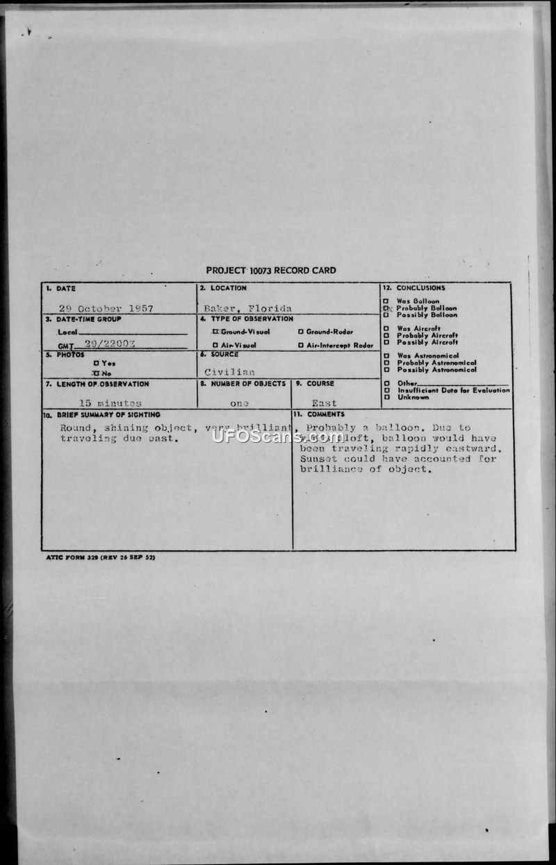 Project 10073 Record Card — Baker, Florida, 29 October 1957