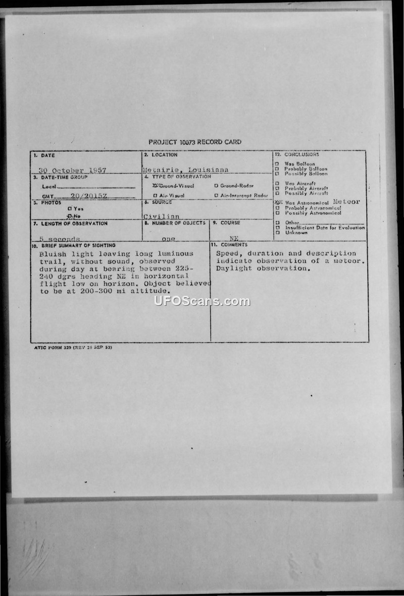 A civilian in Metairie, Louisiana, reported a silent, bluish, luminous object on October 30, 1957. The Air Technical Intelligence Center (ATIC) concluded the sighting was an astronomical meteor.