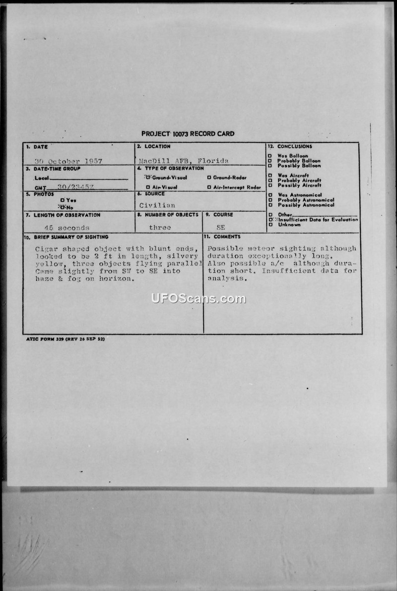 This document consists of a Project 10073 record card and subsequent teletype correspondence regarding a UFO sighting reported on October 30, 1957, near MacDill AFB, Florida. The witness, identified as a Vice President of Mercury Motor Express, reported observing three cigar-shaped, silvery-yellow objects, approximately two feet in length, flying in parallel from the southwest to the southeast. The observation lasted for 45 seconds under clear weather conditions. The initial report was filed by the 660th ACWRON at MacDill AFB. Following the report, internal military communications were exchanged between various commands, including the 35th Air Division, the Air Technical Intelligence Center (ATIC), and the EADF. The Assistant Operations Officer provided an evaluation, suggesting that the objects were likely a formation of aircraft reflecting the sun at sunset. A handwritten annotation on the document further clarifies this assessment, stating that at sunrise or sunset, the sun's reflection can obscure the wings and tail of an aircraft, leaving only the fuselage visible to an observer. The final conclusion recorded on the card is that there was insufficient data for a definitive evaluation, though the military assessment leaned toward an aircraft-related explanation.