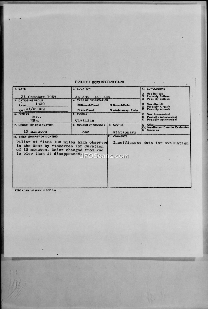 The report documents three luminous sightings reported by Japanese fishermen off the Hokkaido coast. The specific incident on 31 October 1957 involved a stationary pillar of flame that changed color from red to blue before disappearing. Subsequent investigations into other sightings in February 1958, including a suspected explosion, found no evidence of seismic or barometric anomalies indicative of an actual explosion.