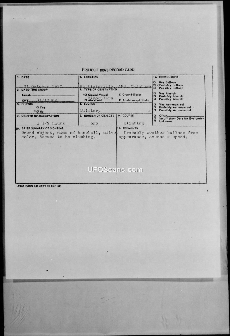 Project 10073 Record Card — Bartlesville, Oklahoma, 31 October 1957