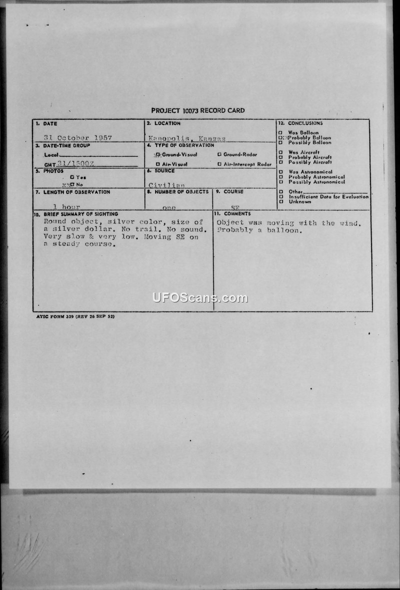 Project 10073 Record Card and Teletype Report — Kanopolis, Kansas, October 31, 1957