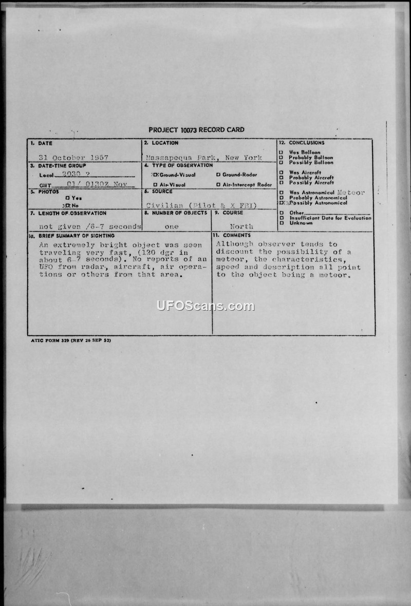 Project 10073 Record Card — Massapequa Park, New York, 31 October 1957