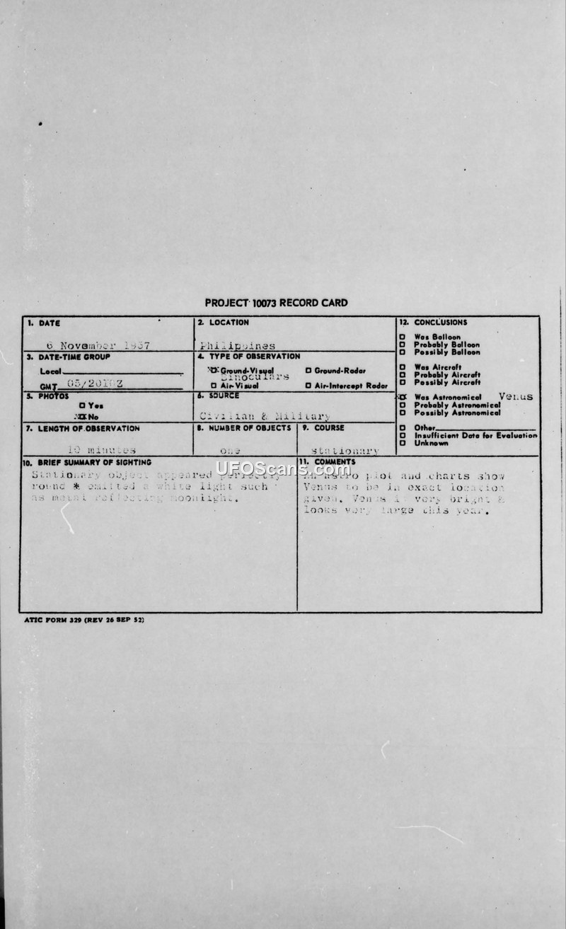 Project 10073 Record Card — Sighting at Camp O'Donnell, Philippines, 5 November 1957