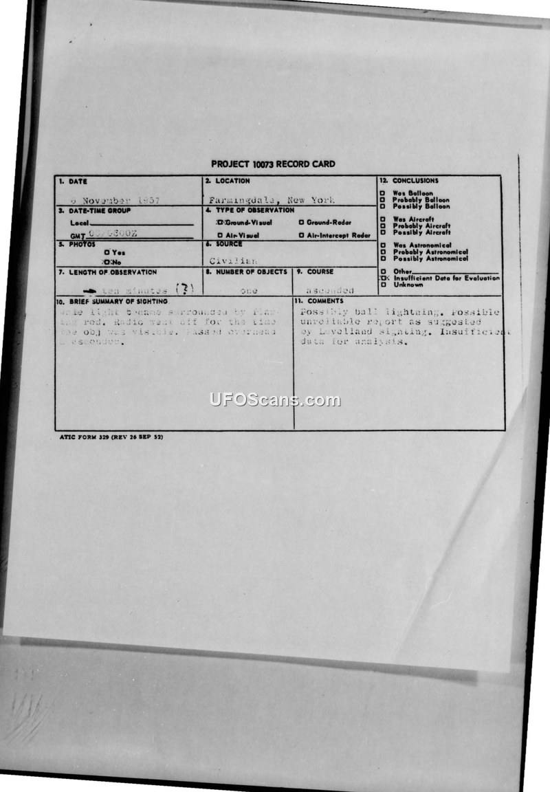 A 1957 sighting report from Farmingdale, NY, involving a bright light and reported radio interference. The military concluded the data was insufficient for analysis, suggesting ball lightning as a possibility.