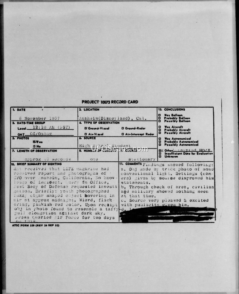 This document details the investigation into a UFO sighting and subsequent photograph taken by a 19-year-old service station attendant in Anaheim, California, on November 6, 1957. The witness, identified in the report as a source, claimed to have observed a fuzzy, cigar-shaped, pinkish-red object hovering over Disneyland for approximately 30 to 40 seconds. He reported stopping his vehicle on a bridge over the Santa Ana Freeway to photograph the object using a Graflex Century camera. The witness stated he moved the film forward one frame to prevent a double exposure, a detail that investigators later cited as evidence of the source's familiarity with photography and potential coaching. The photograph was subsequently brought to the attention of the Garden Grove Daily News and later LIFE magazine, leading to significant media interest and inquiries from the Office of the Assistant Secretary of Defense.