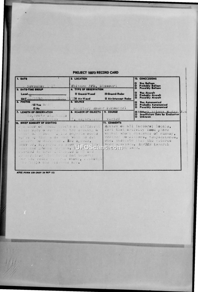 Project 10073 Record Card — Whiteman AFB, Missouri, 6 November 1957