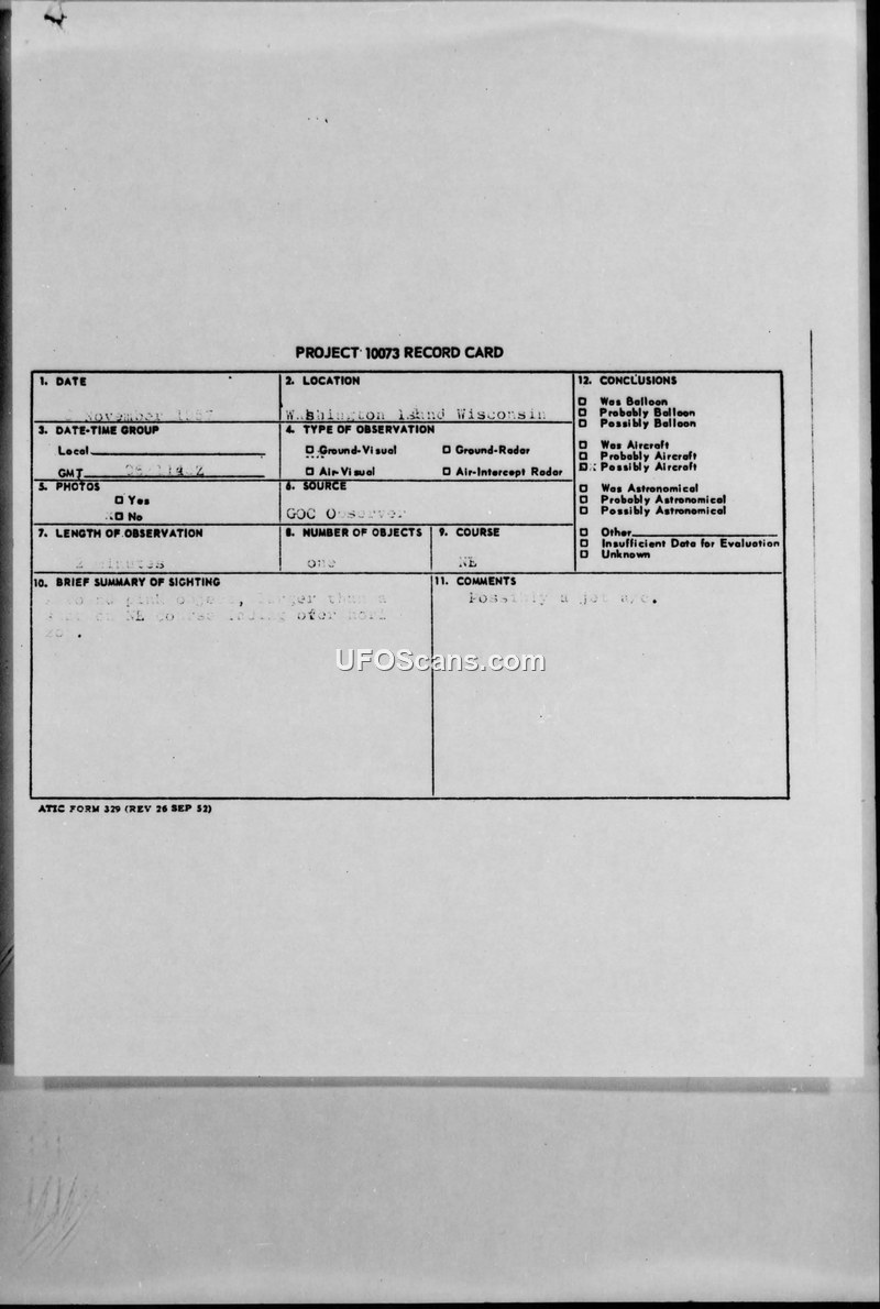 The sighting was reported by a Ground Observer Corps (GOC) observer on Washington Island, Wisconsin. The object was described as a pink, round object larger than a star, moving in a North East direction for two minutes before fading over the horizon. Initial internal notes on the document suggest it was not the Russian Sputnik satellite, as it was on the other side of the earth at that time.
